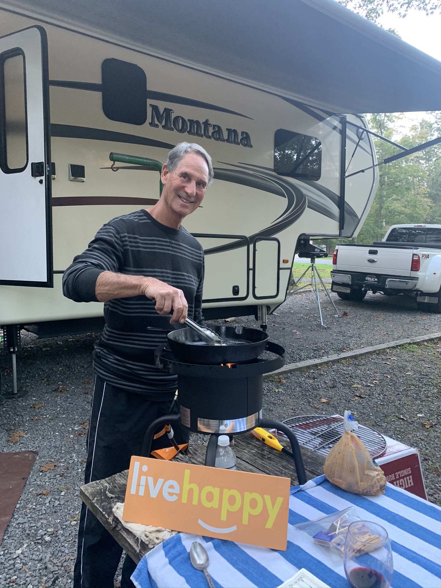 pounds of machinery, was a bit unnerving at first. Only four hours on the road and I’m tired!! The scenery is truly spectacular. Pines, oaks, evergreens of various species and narrow winding mountain roads, as we get off the beaten path and take the scenic routes. Many 25, 20 and even 15 MPH turns, but Virginia roads are extremely well designed and maintained. The leaves are changing by the day and we are delighted with the colors, beginning to show among the canopy and across vast valleys of lush green grass. As we approach our first camp, in the Virginia State park known as Douthat lake, the concept of full time RV living has not set in, but the thrill of adventure and curiosity, overpower any anxieties and misgivings. The camp is forested and inviting. Right away, there are people to greet us and offer help with anything we might need. Setting up for camp proves to be a bit challenging, and the details need to be attended to, in proper order and completed, without exception. Now to relax under a starlit sky, with a campfire warming our feet and hearts. Hikes up and down winding trails, through tall grass and changing trees. The lake is small and we rented a boat, to motor around it, in about three quarters of an hour. A two stage dam, small inlets and a grassy plateau, on the south end, punctuated the bright blue sky. Three nights there and we are in our way again, to Shenandoah National park. Colorful lights around the camps, and active families are a nice addition to the vastness and quiet wonder of the Blue ridge Mountains. A mildly challenging hike up Turks Trail, brought us to a huge view of the Shenandoah Valley, where we met some young hikers who were on the last few days of a six week trek. We casually walked back to the truck, even more thankful for the creature comforts of our fifth-wheel. Back roads lead us to Elkton. A small sleepy suburban town, which was apparently hub of transportation some 100 years ago. Like a magnet, I’m attracted to a brewery, aptly named, “Elkton Brewery.” After a delicious porter, we interviewed the bartender, who is one of the brothers, of the family owned and operated, historic building which is now the new home of this great little brewery. It’s definitely a suggested destination. Another couple nights and breaking down camp once again, to get on down the road. I’m getting more comfortable pulling this behemoth, and a very narrow wood bridge, only about three feet wider than the truck and rig, challenge my new skills, but it’s fun, and proves invigorating to champion. So ends our first week, and two campgrounds, of our journey. And only the beginning of many memories and new friends.